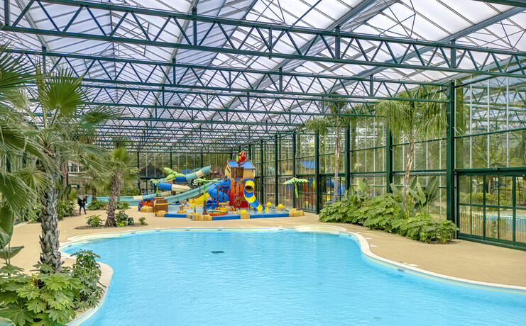 Découvrez notre bassin couvert, idéal pour toute la famille, avec deux toboggans amusants à explorer.